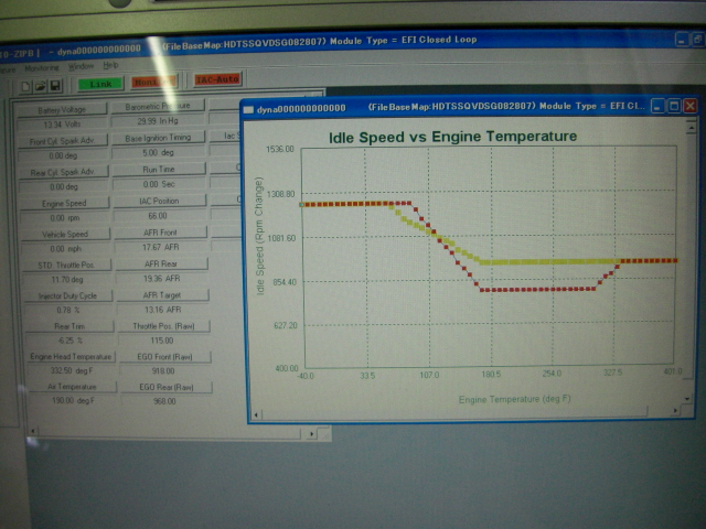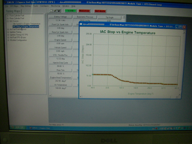 ハーレーダビッドソンのイグニッションをオンにして、サンダーマックスの「チューニングマップ」→「IACカーブ」→「IAC停止 対 エンジン温度」の項目を開いてスマートリンクソフトの「リンク」、「モニターボタン」を押してアイドリングカーブを表示させてエンジンを始動します。