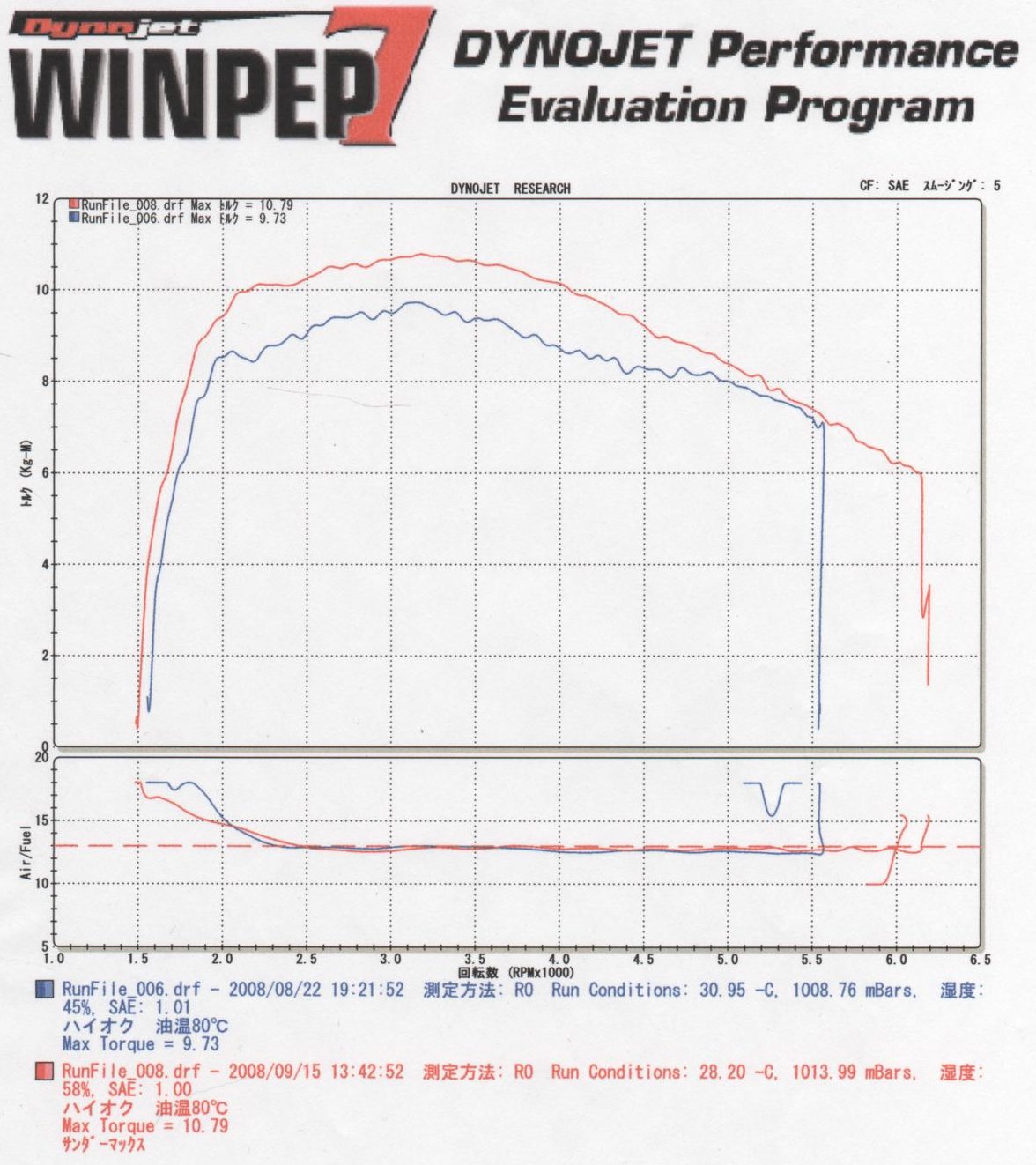 全域において出力が上がっています。サンダーマックスの初期セッティングマップがレブリミット6200RPMなので少し多めにまわしてありますが。