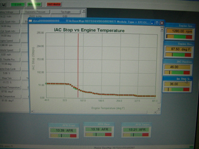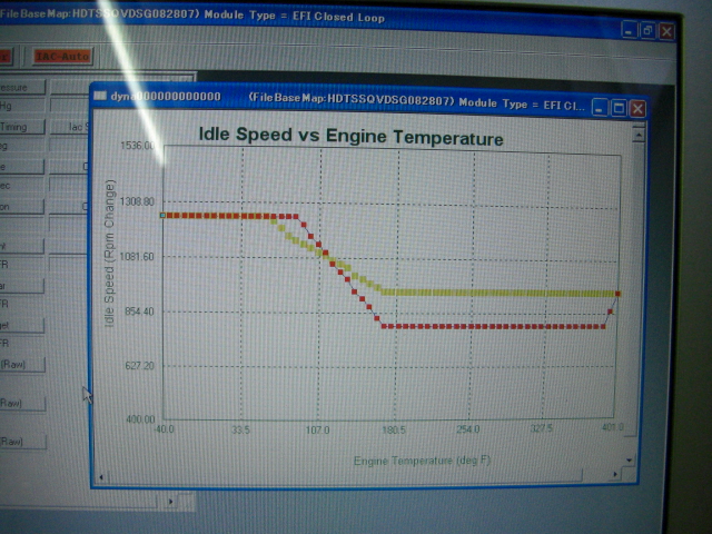 「IACカーブ」の項目を「アイドルスピード 対 エンジン温度」に切り替えるとこんな感じに表示されます。(このグラフではアイドリング回転数を700回転に落としてあります。 また、安全マージンをとるためにハーレーダビッドソンのエンジン温度が華氏280度を超えると800回転を目指してアイドリング上昇させています。