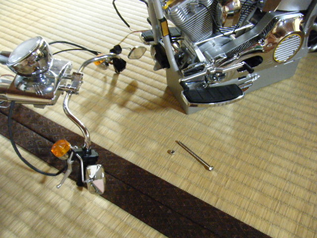 ハーレーダビッドソンの組み立ては、ステムシャフトでフロント周りを接続します。