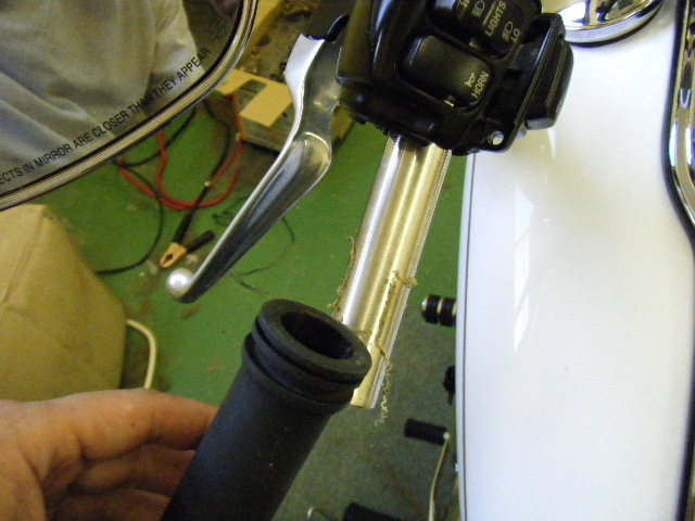 ハーレーダビッドソンのグリップの内部には溝が4箇所切ってあるので、そこに接着剤を流して再び回転させながら組み付けます。