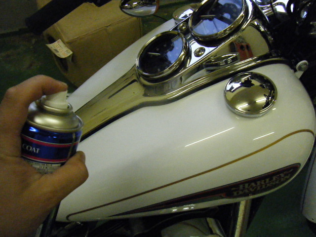 30cmほど離してハーレーダビッドソンにバリアスコートを吹き付けます。