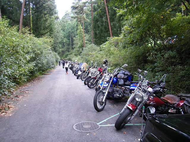 キャンプ場までの通路がハーレーダビッドソンの駐車場になります^