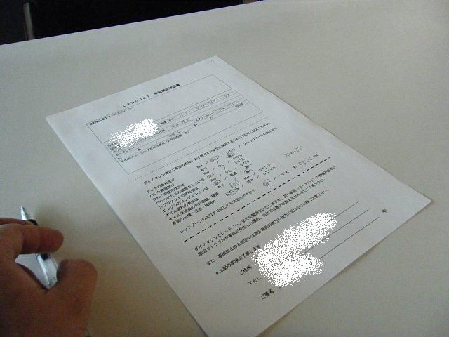 馬力計測前に車両のチェック項目や同意書にサインです。