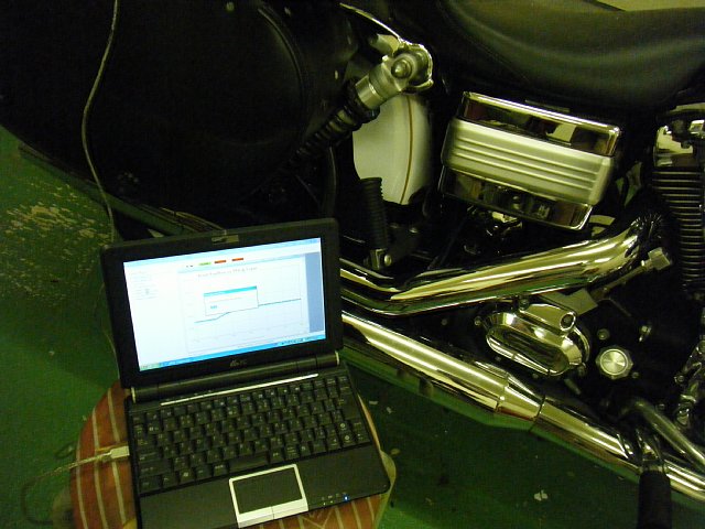 ハーレーダビッドソンにパソコンを接続してコンピューターのセッティングです。