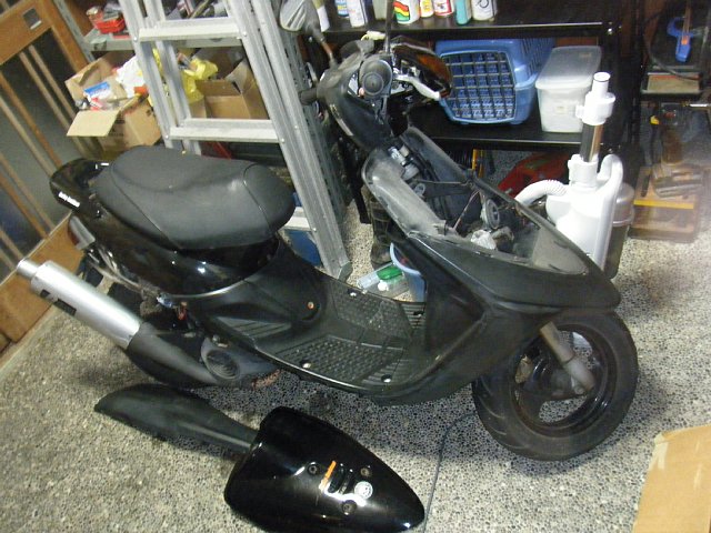 93年式スーパージョグZです。以前自分で63ccボアアップキットを組み込んで駆動系をハイスピード仕様に交換したやつが出戻ってきました^^;