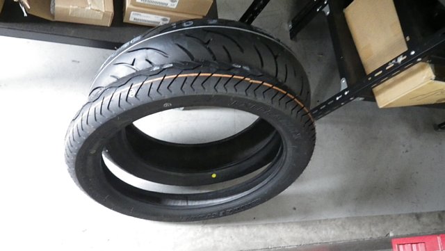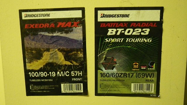 新しいタイヤはフロントがブリジストンの新製品エクセドラ マックス(ツーリングタイヤ)100/90-19M/C (バイアス)リヤがバトラックスBT-023スポーツよりのツーリングタイヤ 160/60ZR17(ラジアル)です。