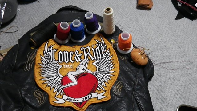 革ジャンの形になってると手縫いじゃないと縫いにくい、というか縫えない。のもありますが、無理にミシンを当てるとどうしてもずれてしまうこともあるので、工賃はそれなりになりますが背中のパッチと腕のパッチは手縫いにしてもらいます。