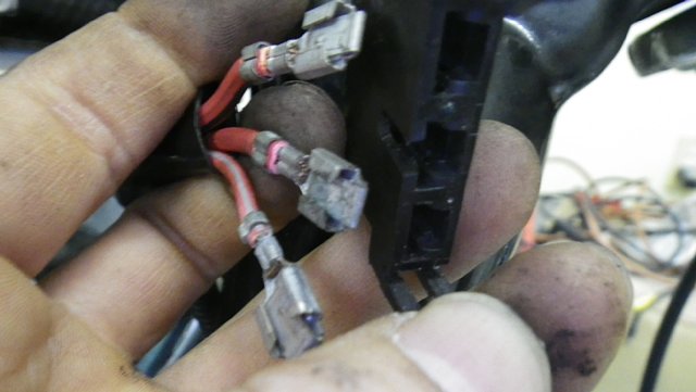 はずして端子をチェックすると、このサイズでは考えられないほど簡単に抜けちゃいました。真ん中の端子にはなんか腐食みたいなのがへばりついてるし・・・・