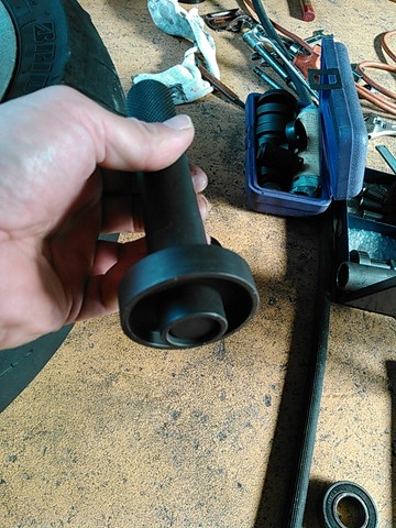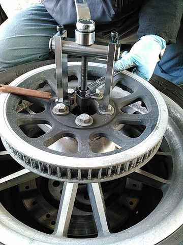 ベルトプーリーを装着した状態では結構深い位置にベアリングがあるのですが、リムーブツールの調整内だったのでプーリーは外さずにベアリングを抜きます。