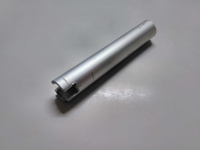 長めのスプリングを押し込むのでアルミパイプで専用冶具を作ってみました。追記:寸法の質問があったのでサイズ記載します(パイプ径10mm 全長62mm 切り欠きの幅4mm 深さ5mm)