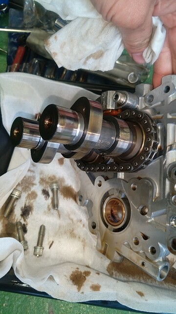 カムサポートプレートを純正カムと一緒にクランクケースから抜いたので、まずは現状の確認