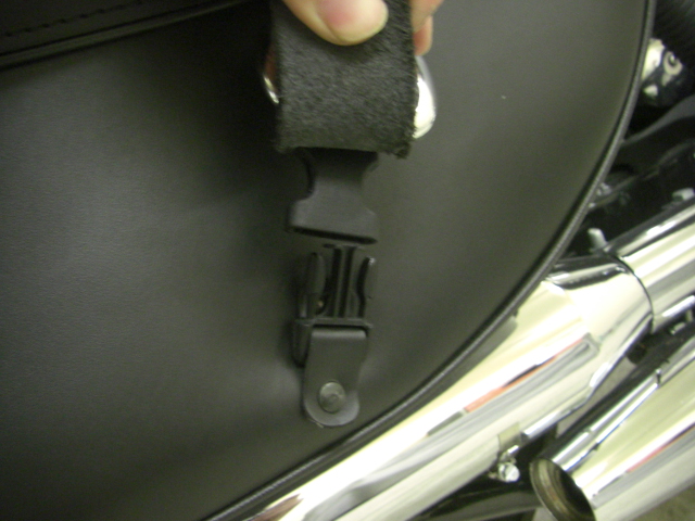 ハーレーダビッドソンのレザーサドルバッグはワンタッチでロックをはずせるバックルが裏に隠れています。