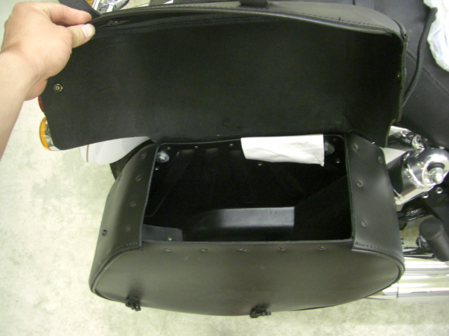 蓋を開けるとサドルバッグの口は少しすぼんだ形状になっているので入れた荷物が飛び出しにくくなっています。