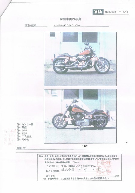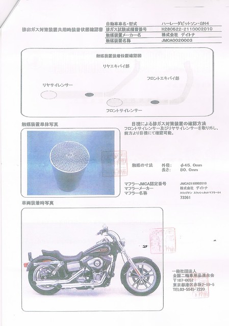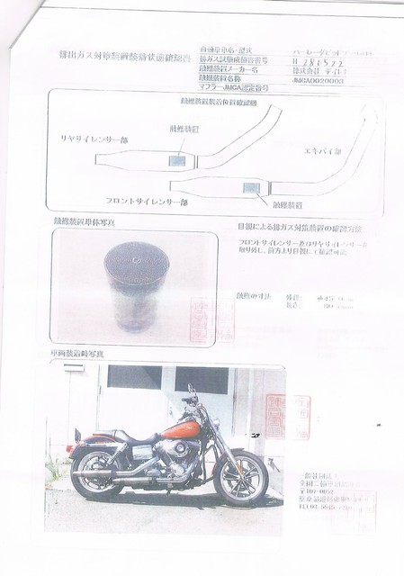 この書類と私の2008年式ダイナローライダーの車検証をもとに陸運局でOKもらっていますので、次回の車検では認証工場ですんなり車検が通せるはずです。