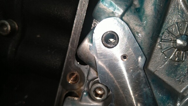 カムサポートプレートの油圧カムチェーンテンショナー取り付け上の穴の向こうはクランクケース肉厚部に接地しているのでノーマルカムサポートプレートでは取り付けボルトが0.5mmほど出っ張るのでそのままでは取付時にクランクケースにめり込みます。
