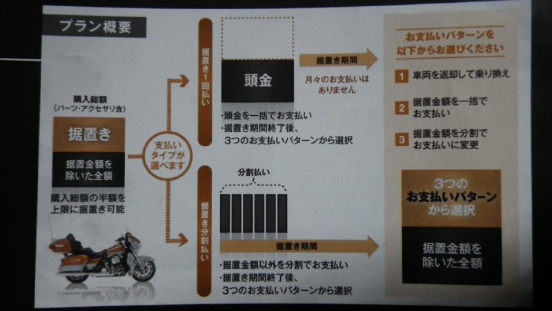 購入金額の半額を3年間据え置くことで予算の半額でハーレーダビッドソンが購入できる。