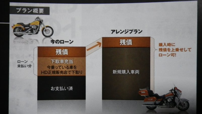 ハーレーダビッドソンのローンはあくまで自動車ローンであり担保があって初めて成立するという貸金法?の縛りがあるわけなので、車両乗り換えの場合なら残金を新たに組み替えてローンできるという仕組みらしいです。