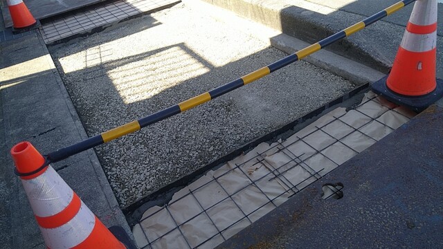 本当はここまでひどくなったら、一旦高圧洗浄機でもろくなったコンクリ部分を徹底的に吹き飛ばした後プライマーで下地を塗ってから施工しないといけないのですが、今回はブラシ着き集塵機でごしごしやるだけにしました。忙しいもので・・・