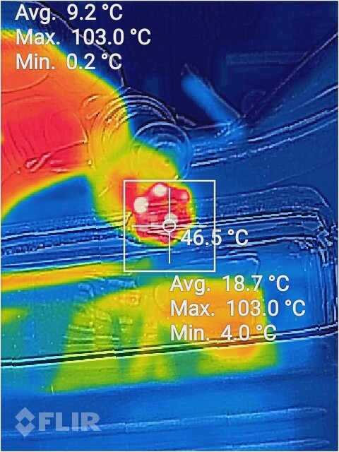 サーマルカメラで見るとわかりやすいですね(実画像と温度分布、焦点によってはずれてます)