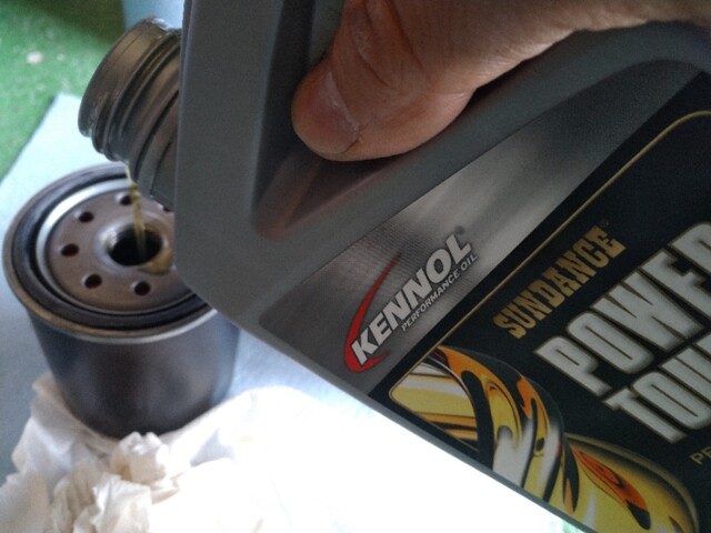 新品オイルフィルターには交換オイルを満たしてから組付けします。