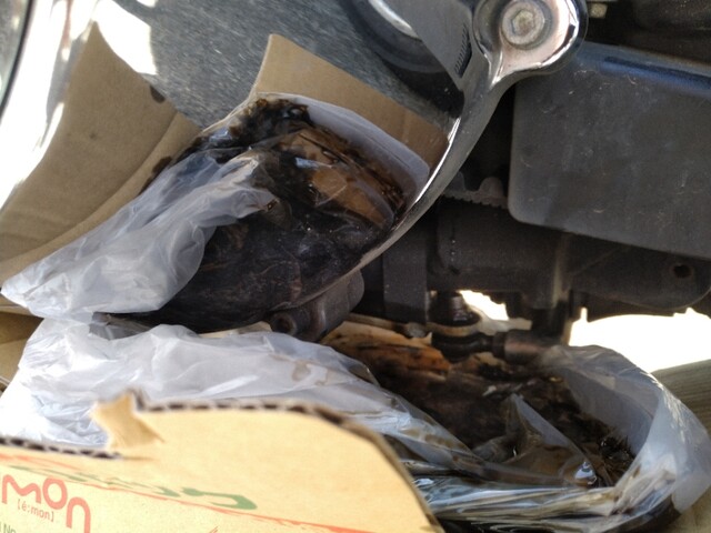 少し走ってエンジンを温めてからジャッキをかけて車体を水平にした後で、オイル受けを用意してから右側の下回りドレンボルトを5/8インチの工具で緩めます。