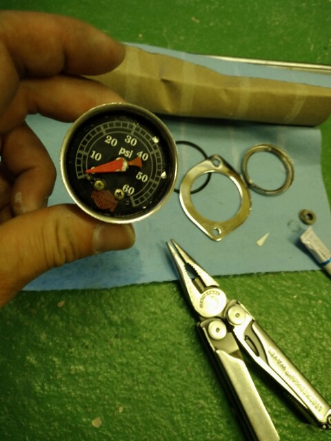針だけ折って油圧計の軸に瞬間接着剤で固定しました。