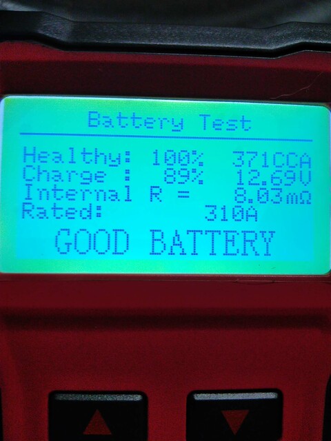 ノーマルの小さいバッテリーと並列した状態でチェックした表示ですが、まあテスト上は問題ないのでしばらく動かいてない+冬の寒さで始動の負荷が大きいのかな。